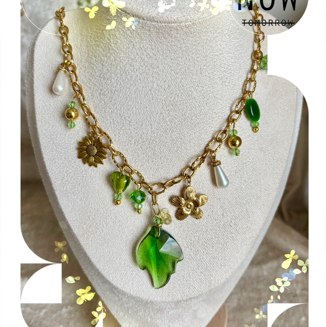 Cet élégant Collier breloques a été créé sur une chaîne en acier inoxydable avec différentes breloques en verre façon Murano, perles facettes, perles en verre de bohème, perles dorées, avec une très jolie feuille en cristal verte
