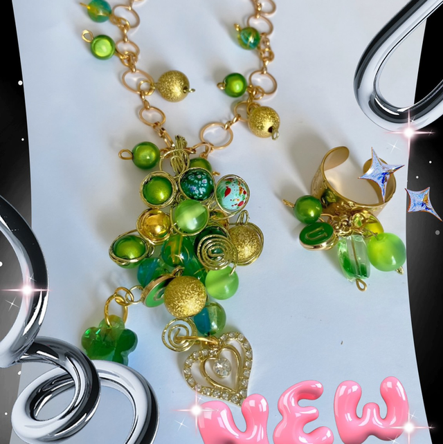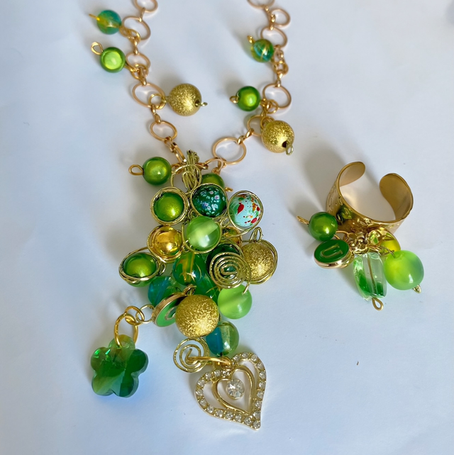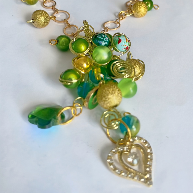 cette originale création dorée composée d’un collier de multiples perles vertes et dorées est unique