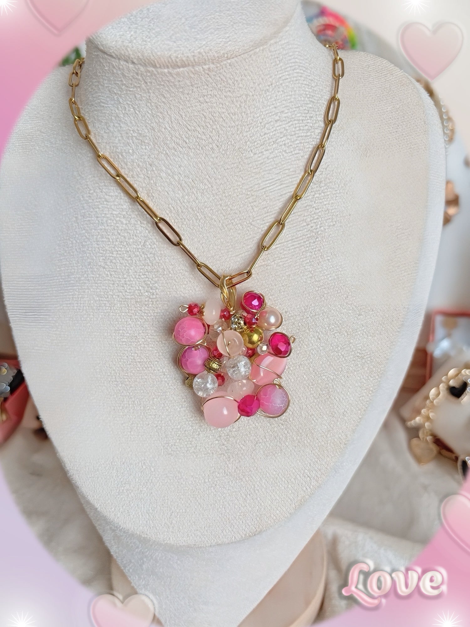 🌸 Découvrez notre collier Cyndirella composé de perles naturelles de quartz et de verre, alliant les couleurs rose, parme et fuchsia. Fabriqué à la main, il est monté sur un fil en acier inoxydable doré de qualité, offrant à la fois robustesse et élégance. Ajoutez une touche de glamour à votre tenue avec nos perles craquelées et petites opales roses.
