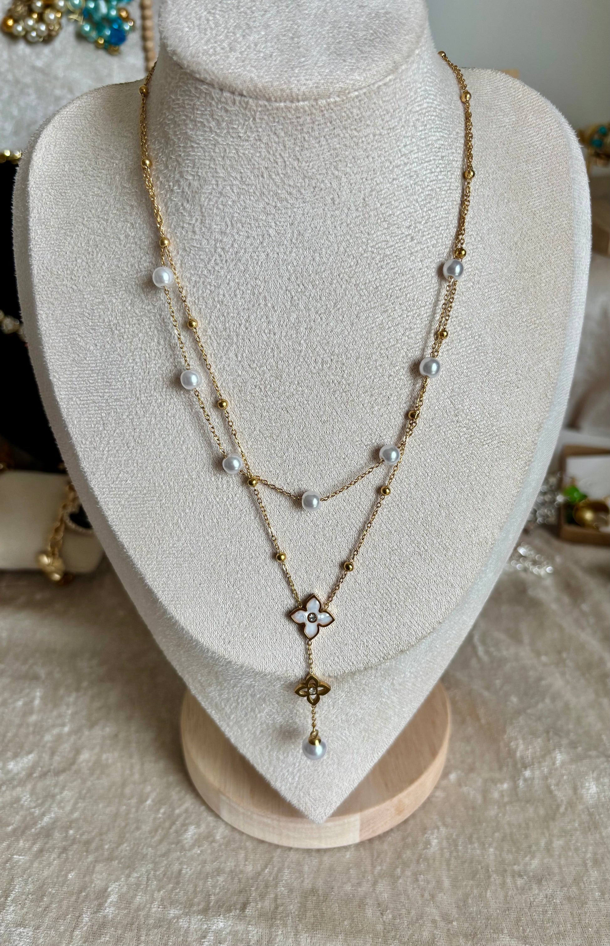 Collier Kyla est un sublime double collier avec des perles nacrées et des perles dorées en acier inoxydable. Ce collier est à la fois élégant et durable, grâce à sa composition en acier inoxydable. Les perles nacrées apportent une touche de sophistication tandis que les perles dorées ajoutent une touche de brillance. Parfait pour compléter n'importe quelle tenue avec style et durabilité