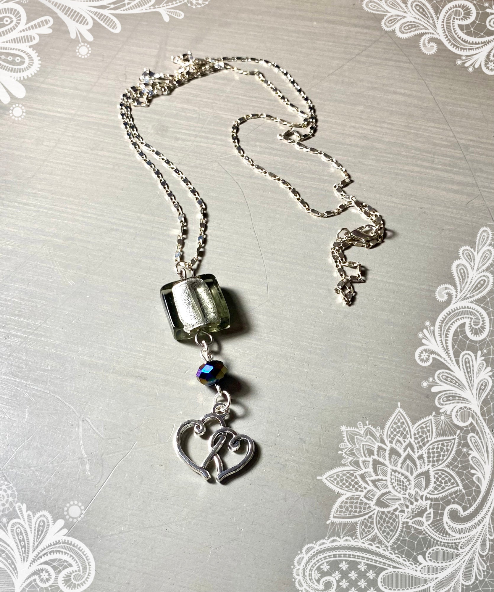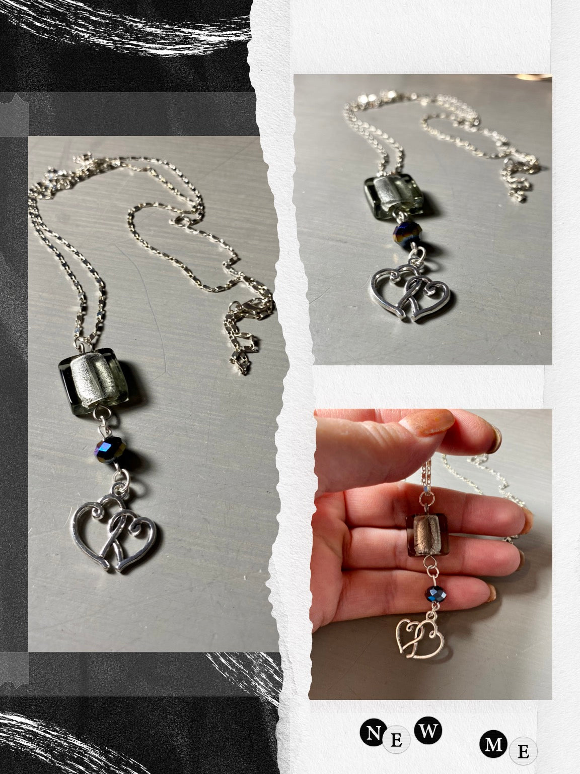 Ravissant sautoir Cora avec perles carrée noire en verre façon Murano et perle de bohème à facettes noire en verre avec un joli cœur acier